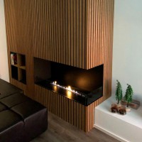 Foco Corner: Modelo de canto, ideal para embutir na parede e aproveitar ao máximo o espaço. Pode ser escolhido em versão direita ou esquerda, com abertura frontal e lateral para uma vista ampla das chamas.