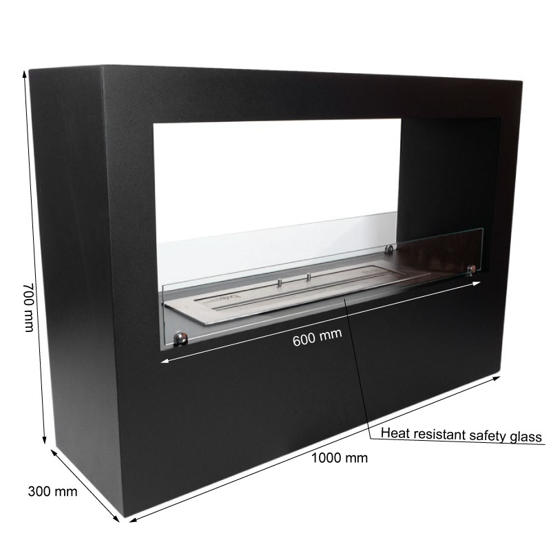 Esta lareira a bioetanol preta, de dois lados, é uma lareira de pé com vista de ambos os lados, permitindo-lhe desfrutar das chamas de ambos os lados. Ideal como divisor de ambientes entre espaços como a sala de estar e a cozinha, também pode ser embutida numa parede. Com um queimador manual de 3,5 litros, oferece até 7,5 horas de combustão e uma potência máxima de 3,3 kW. Fácil de instalar sem necessidade de eletricidade ou chaminé, inclui vidro de segurança, controlo de chama e ferramentas de extinção, garantindo uma solução de aquecimento segura e elegante.