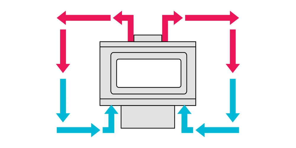O ar à volta da lareira aquece e circula naturalmente pela divisão, distribuindo o calor de forma mais uniforme. Este processo é ideal para garantir conforto constante em salas de tamanho pequeno a médio.